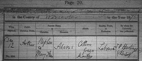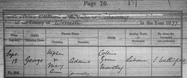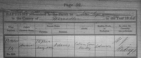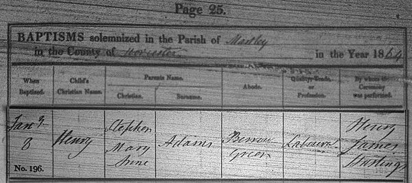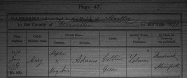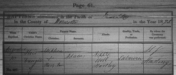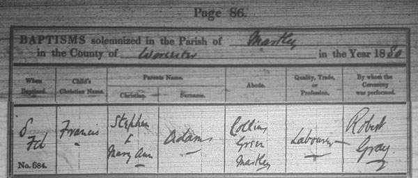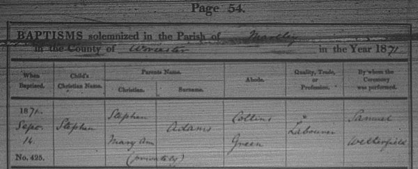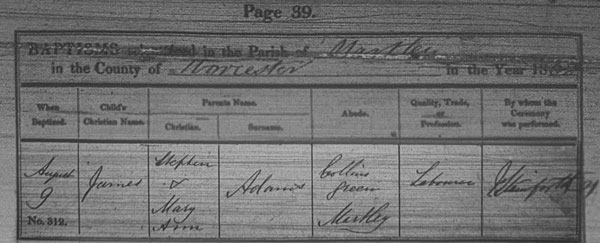 Baptisms at St. Peter's Church Martley, of the children of Stephen & Mary Ann Adams