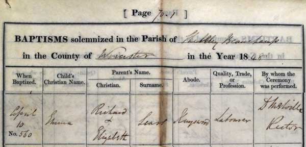 Baptism: 10th April, 1848. All Saints Church, Shelsley Beauchamp, Worcestershire.