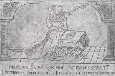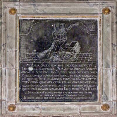 "In sacred memory not without tears most beloved Elizabeth faithful consort of Stephen Boughton Sub Dean of the Chapel Royal; Daughter and heir of John Cyrill (Kyrle) citizen and counselor of Hereford. Of pious, charitable, tolerant virtues for all of her 46 years of life She died the 19th day of the month of June AD 1623"