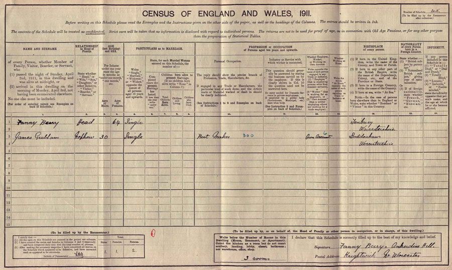 Address: Gold Hill, Doddenham, Worcestershire.James Grubham (Head)