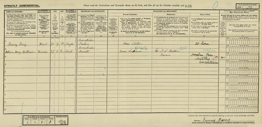 Occupation: Farm Labourer - to Mr. J. L. Walker. Horsham Farm, Martley, Worcestershire.