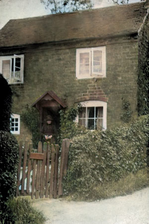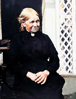 Fanny Berry, outside Haywood Cottage, at the top of Ankerdine Hill, Knightwick, Worcestershire. [colourised photo]