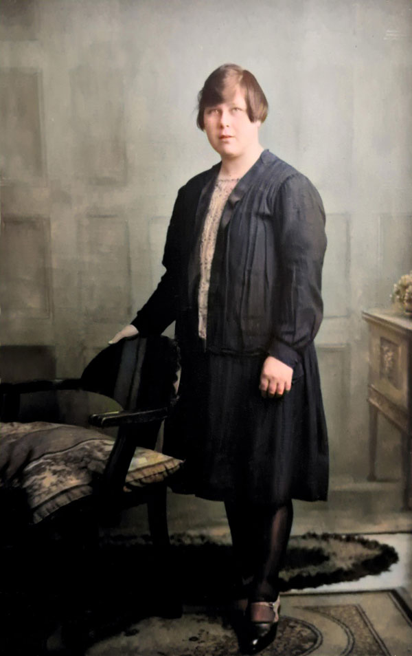 Norah Hayward, seen here in a beautiful portrait of her. [Colourised from an original black and white, many thanks to her son Raymond Roberts]