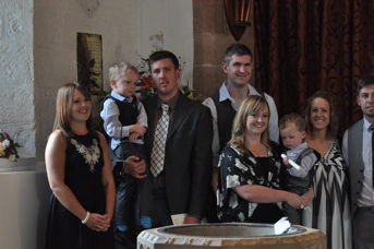Richard Holland (godparent/uncle) holding his nephew Finley Holland, his brother and sister-in-law Alex & Gemma Holland with Riley and godparents Natasha Strickland, David Hooper and Daniel Constable(holding his son). |