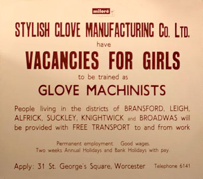 A much later addition to the Worcester Glove manufacturing industry, Milore glove factory operated from 1946 to 1981. It was the second-last glove company in Worcester, employing mostly women and young girls who had to undergo 6 weeks intensive training to qualify as a skilled glove maker. They were paid for each pair produced so they had to be quick and produce good quality gloves. Many women left the factory once they got married but many were able to continue to earn money by having a sewing machine at home. Being an outworker was a means of remaining employed after marriage. There was a strong community spirit amongst the employees who enjoyed staff trips to the seaside and who socialised outside of work by going dancing together. The company specialised in producing high fashion women's gloves, and commissioned up and coming designers to develop the appeal of a fashionable brand. The gloves and other artefacts such as photographs, leather colour cards, letters and glove patterns, were saved for future reference when the factory finally closed. The Museums Worcestershire archive collection contains numerous pairs of unworn Milore, brand-new leather gloves in an array of bright jewel colours, still in their cellophane wrappers. Gloves in a range of exciting colours including powder blue, fuchsia, buttercup yellow, and turquoise can be seen with a range of different pattern effects. Bows, embroidery, cut-out pattern effects, ruching, and many other intricate and unusual design details can be seen. In the early years the Bromyard factory closed for several weeks in September so the girls could go hop-picking with their families on the farms in the surrounding areas. There were staff trips to the seaside, Dudley Zoo and, in October, a weekend visit to see Blackpool's Illuminations that ended with dancing the hours away. |