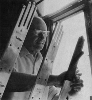 Ray Wright ironing or more correctly, laying out, the completed gloves on equipment which dates from the First World War and which, within the industry, has not been altered. Royalty, film stars and air hostesses are just a few who put their hands into the firm's gloves. Did you know that Americans have shorter fingers than we have, or that Japanese have smaller hands? Norwegians look for warmer gloves while the conservative Swiss prefer theirs plain. The glove industry starts making its winter collection in March, when most of us are thinking about summer, and then its Spring gloves go into production in October. Mr Helwing says that fashion is very conservative at the moment and is not giving them a chance to make some of the more interesting colours and embroidery that they enjoy but he hopes things will improve soon. |