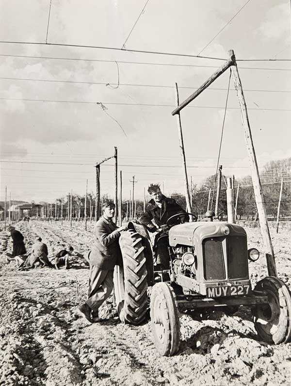 Working in the hopyards at Ankerdine, Knightwick, Worcestershire, 25th April, 1958. Ted Morris on the tractor and standing by him George Yates (Farm Bailiff).