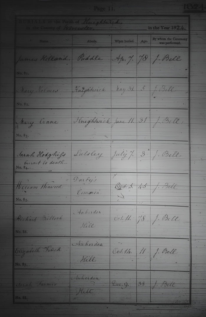 Number Forename Surname Residence Burial Day Burial Month Burial Year Age Ceremony Performed by 81 James Holland Puddle. 7 April 1824 78 John Bell 82 Mary Holmes Knightwick. 31 May 1824 5 John Bell 83 Mary Crane Knightwick. 11 June 1824 31 John Bell 84 Sarah [burnt to death] Hodgkiss Lulsley. 7 July 1824 3 John Bell 85 William Winwood Darby's Common. 5 October 1824 45 John Bell 86 Richard Bullock Ankerdine Hill. 11 October 1824 78 John Bell 87 Elizabeth Finch Ankerdine Hill. 14 October 1824 11 John Bell 88