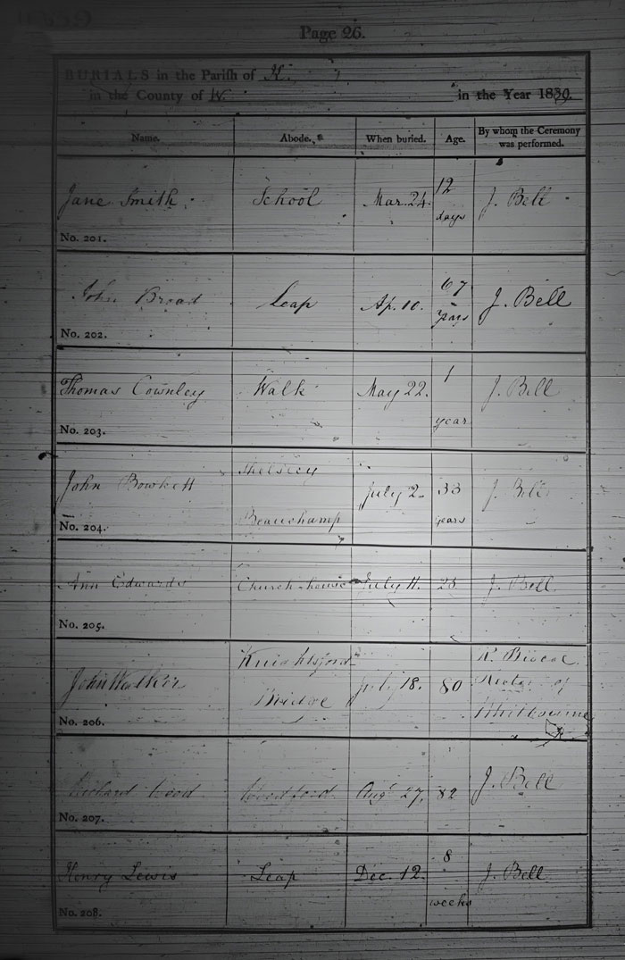 Number Forename Surname Residence Burial Day Burial Month Burial Year Age Ceremony Performed by 201 Jane Smith School. 24 March 1839 12 days John Bell 202 John Broad Leap. 10 April 1839 67 John Bell 203 Thomas