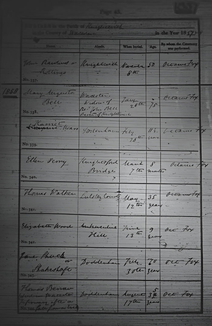 Bell Worcester. 28 January 1858 75 Octavius Fox [Widow of the Rev. John Bell, Rector of Knightwick - see page 37, no. 294] 339 Harriet Mears Doddenham. 26 February 1858 111/2 Octavius Fox 340 Ellen