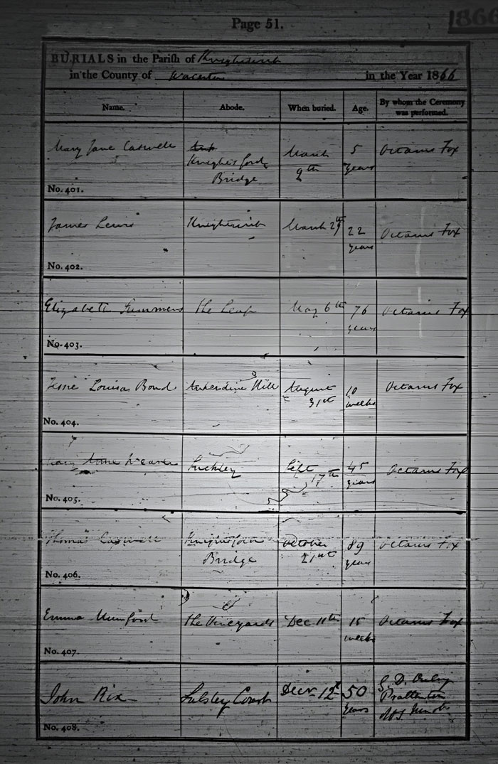 Number Forename Surname Residence Burial Day Burial Month Burial Year Age Ceremony Performed by 401 Mary Jane Caswell Knightsford Bridge. 2 March 1866 5 Octavius Fox 402 James Lewis Knightwick. 29 March 1866 22 Octavius Fox 403 Elizabeth Summers The Leap. 6 May 1866 76 Octavius Fox 404 Jessie Louisa Bond Ankerdine Hill. 31 August 1866 10 weeks Octavius Fox 405 Mary Anne Weaver Suckley. 17 September 1866 45 Octavius Fox 406 Thomas Caswell Knightwick Bridge. 21 October 1866 89 Octavius Fox 407 Emma Mumford The Vineyards. 11 December 1866 15 weeks Octavius Fox 408 John
