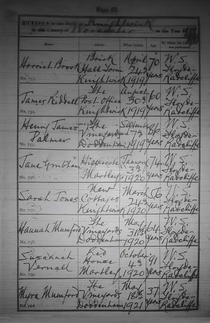 Floyde-Radcliffe756 Jane Grubham Hipplecote Martley. 3 January 1920 74 William Searle