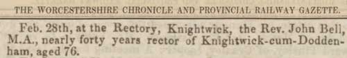 John Bell died 28th February, 1852 at the Rectory, Knightwick, Worcestershire.