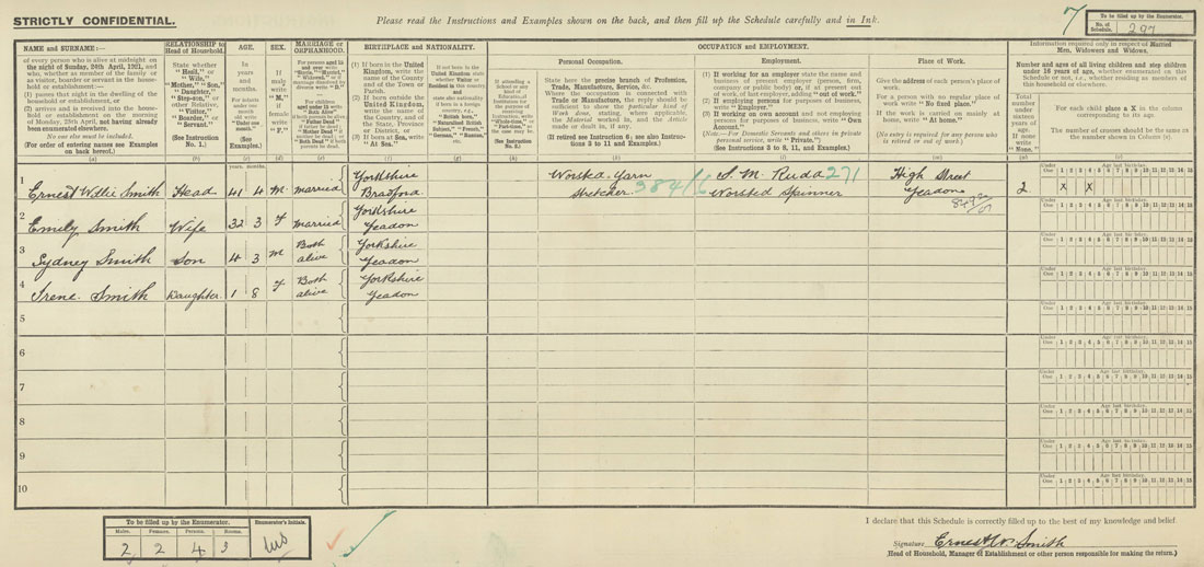 Address: 10, Carlton Street, Yeandon, Yorkshire (West Riding)*Ernest Willie Smith (Head)