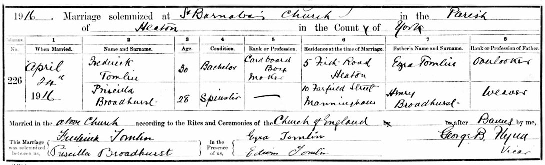 Fathers: Ezra Tomlin (Overlooker) & Henry Broadhurst (Weaver)