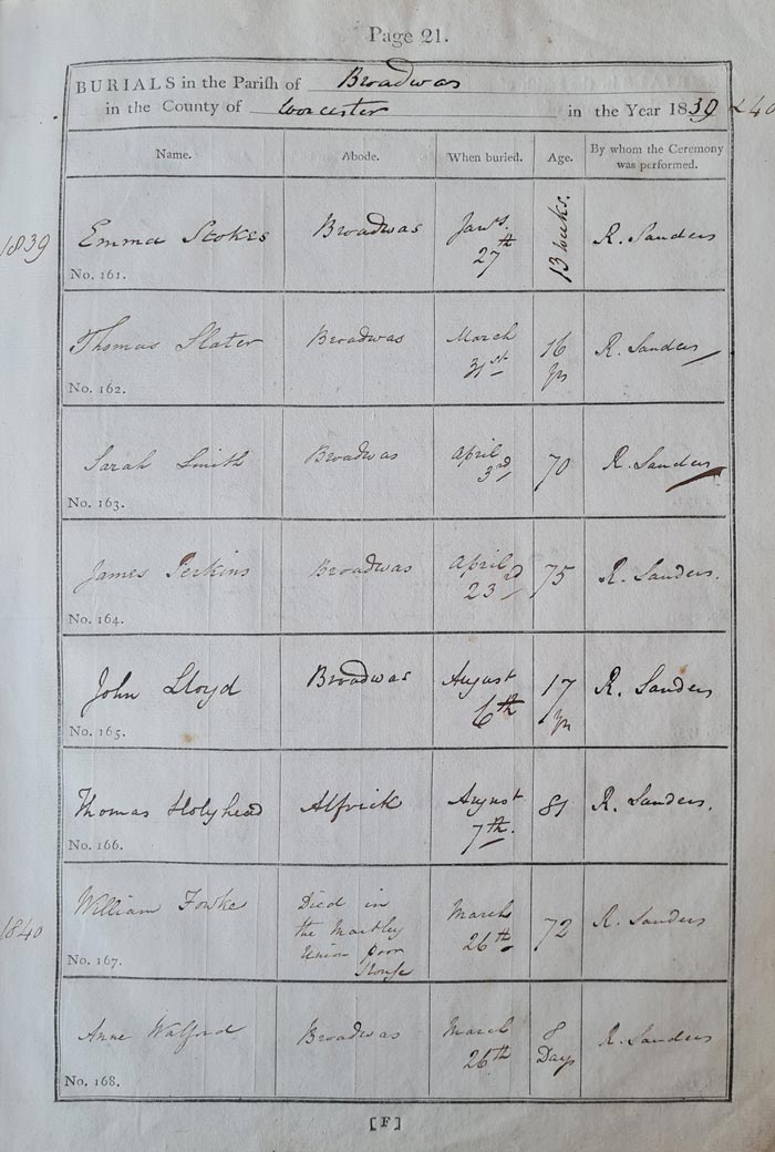 No. Forename Surname Residence Day Burial Month Year Age Minister 161 Emma Stokes Broadwas. 27 January 1839 13