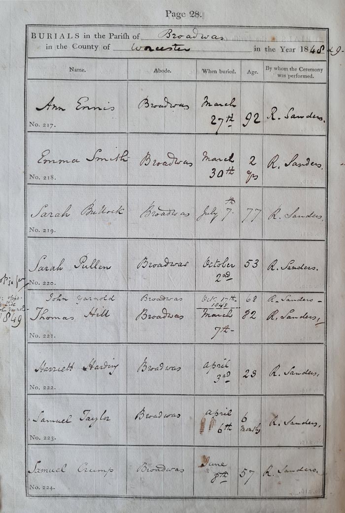 No. Forename Surname Residence Day Burial Month Year Age Minister 217 Ann Ennis Broadwas. 27 March 1848 92 Robert