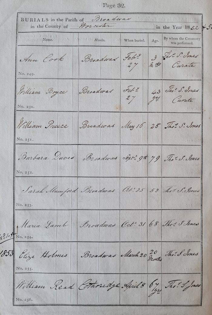 Jones.254 Maria Lamb Broadwas. 31 October 1852 68 Thomas S.