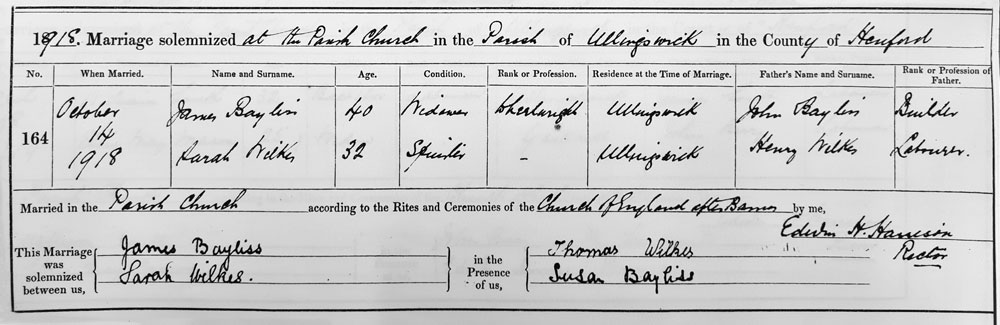 Fathers: John Bayliss, Builder and Henry Wilkes, Labourer.
