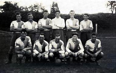 Dad also played for the Broadwas-on-Teme Football Club. This photograph was taken at the end of the 1935-36 season. From the left, back row: Tom Delahay, Tom Bosward, Herbert Rickets, Ted Holland, Dick Holmes and Albert (Toddler) Rickets; front row: Jack Spencer, Harry Knight, Ivor Griffiths, Bob Holmes and Sid Ganderton. Dad played in goals and was still playing for Knightwick into his fifties.