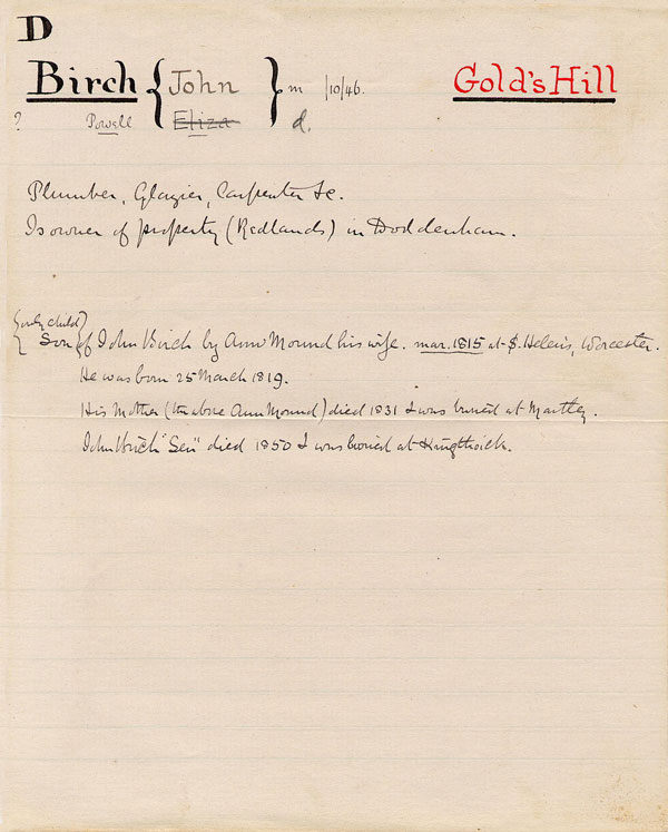 Is owner of property (Redlands) in Doddenham.Only child son of John Birch, by Ann Mound his wife. March, 1815, at St. Helen's, Worcester.