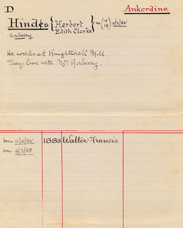 Hinds [m. 15/2/1885] Herbert Ankerdine Edith [Clarke Rowberry] He works at Knightwick Mill. They live with Mr. Rowberry b. 11/6/1885 Walter Francis b. 9/3/1888 Edith May