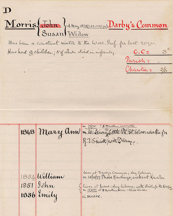 b. Lulsley. 1851 John Lives at Darby's Common; day labourer. m. 25/10/1877, to Phobe Rawlings; works at Knowles. b. Lulsley. 1854 William Lives at home; day lanourer, with Bishop the Keeper. M. 12/6/1887, to Alice Winders, at St. Martin's, Worcester. b. Doddenham. 1856 Emily In Service. [Possibly:- John Morris, married, Susan Bridges, 20th December, 1846, St. Michael in Bedwardine, Worcester]
