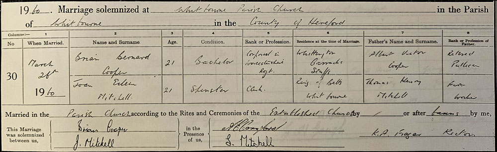 Brian Bernard Cooper - Age: 21, Bachelor - Occupation: Corporal in Worcester Regiment - Address: Whittington Barracks, Staffordshire. Father: Albert Victor Cooper - Retired.