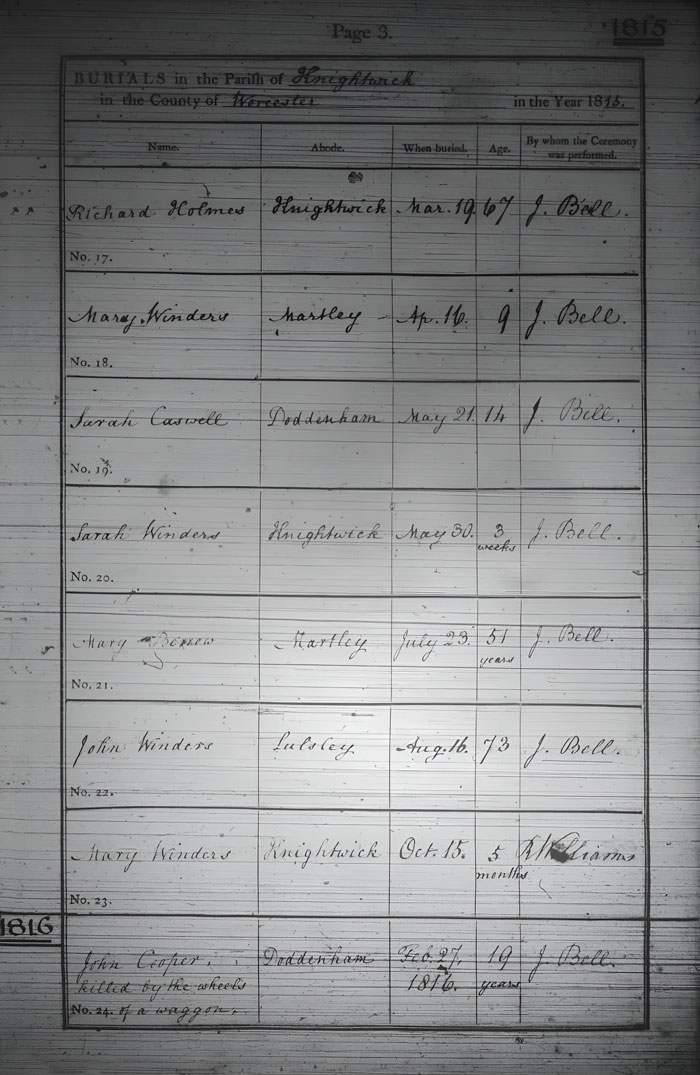 Number Forename Surname Residence Burial Day Burial Month Burial Year Age Ceremony Performed by 17 Richard Holmes Knightwick. 19 March 1815 67 John Bell 18 Mary Winders Martley. 16 April 1815 9 John Bell 19 Sarah Caswell Doddenham. 21 May 1815 14 John Bell 20 Sarah Winders Knightwick. 30 May 1815 3 weeks John Bell 21 Mary Berrow Martley. 23 July 1815 51 John Bell 22 John Wilders Lulsley. 16 August 1815 73 John Bell 23 Mary Winders Knightwick. 15 October 1815 5 months R.Williams 24 John