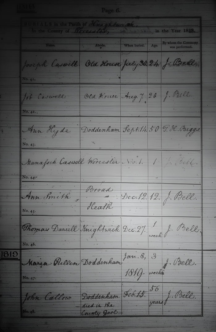 Number Forename Surname Residence Burial Day Burial Month Burial Year Age Ceremony Performed by 41 Joseph Caswell Old House. 30 July 1817 24 John Bell 42 Job Caswell Old House. 7 August 1817 20 John Bell 43 Ann Hyde Doddenham. 14 September 1817 50 T. H. Biggs 44 Manafseh Caswell Worcester. 1 November 1817 1 John Bell 45 Ann Smith Broad Heath. 12 December 1817 12 John Bell 46 Thomas Daniell Knightwick. 27 December 1818 1