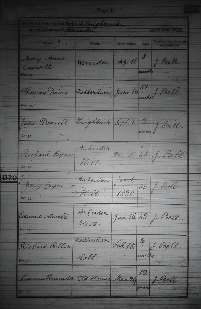 Number Forename Surname Residence Burial Day Burial Month Burial Year Age Ceremony Performed by 49 Mary Ann Caswell Worcester. 11 April 1819 8 months John Bell 50 Thomas Davies Doddenham. 316 June 1819 51 weeks John Bell 51 Jane Daniell Knightwick. 1 September 1819 3 years John Bell 52 Richard Payne Ankerdine Hill. 5 December 1819 45 John Bell 53 Mary Payne Ankerdine Hill. 1 January 1820 86 John Bell 54 Edward Newell Ankerdine Hill. 16 January 1820 42 John Bell 55 Richard Pullen Doddenham Hall. 15 February 1820 2 months John Bell 56 Sussanna Burraston Old House. 29 March 1820 12 John Bell