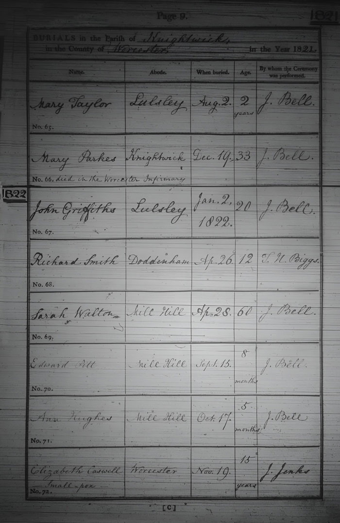 [died in the Worcester Infirmary]Parkes Knightwick. 19 December 1821 33 John Bell 67 John Griffiths Lulsley. 2 January 1822 20 John Bell 68 Richard Smith Doddenham. 26 April 1822 12 T. H. Biggs 69 Sarah Walton Mill Hill. 28 April 1822 60 John Bell 70 Edward Pitt Mill Hill. 15 September 1822 8