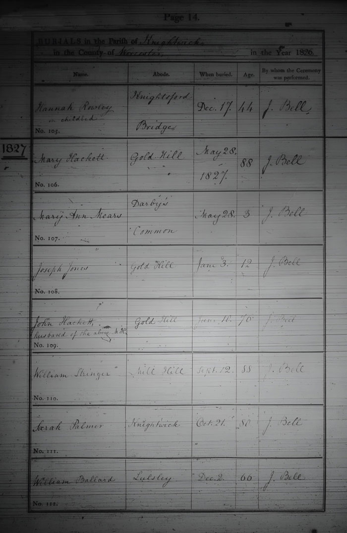 Number Forename Surname Residence Burial Day Burial Month Burial Year Age Ceremony Performed by 105 Hannah [in childbed] Rowley Knightsford Bridge. 17 December 1826 44 John Bell 106 Mary Hackett Gold Hill. 28 May 1827 88 John Bell 107 Mary Ann Mears Darby's Common 28 May 1827 3 John Bell 108 Joseph Jones Gold Hill. 3 June 1827 12 John Bell 109 John [husband of the above, Mary] Hackett Gold Hill. 10 June 1827 70 John Bell 110 William Stringer Mill Hill. 12 September 1827 88 John Bell 111 Sarah Palmer Knightwick. 21 October 1827 80 John Bell 112