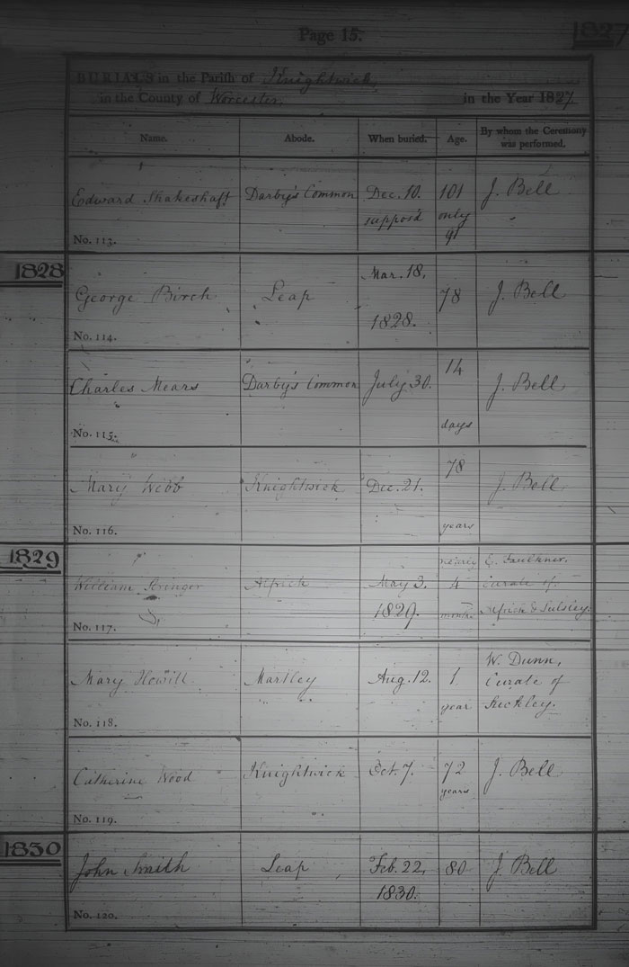 Number Forename Surname Residence Burial Day Burial Month Burial Year Age Ceremony Performed by 113 Edward Shakesshaft Darby's Common. 10 December 1827 101 [Supposed only 91] John Bell 114 George Birch Leap. 18 March 1828 78 John Bell 115 Charles Mears Darby's Common 30 July 1828 14 days John Bell 116 Mary Webb Knightwick. 21 December 1828 78 John Bell 117 William Stringer Alfrick. 3 May 1829 4 months E. Faulkner, Curate of Alfrick & Suckley. 118 Mary Hewill Martley. 12 August 1829 1 W. Dunn, Curate of Suckley. 119 Catherine Wood Knightwick. 7 October 1829 72 John Bell 120
