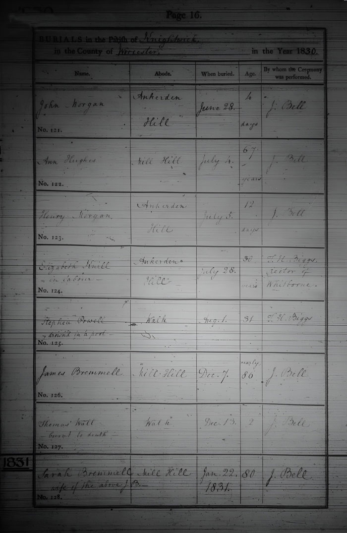 Number Forename Surname Residence Burial Day Burial Month Burial Year Age Ceremony Performed by 121 John Morgan Ankerdine Hill. 28 June 1830 4