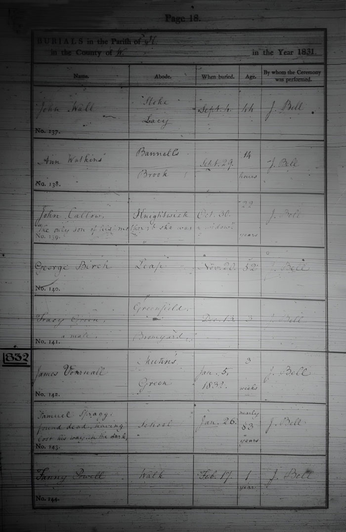 Number Forename Surname Residence Burial Day Burial Month Burial Year Age Ceremony Performed by 137 John Wall Stoke Lacy. 4 September 1831 44 John Bell 138 Ann Watkins Banners Brook. 29 September 1831 14