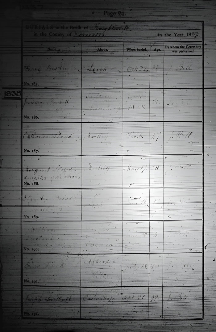 Number Forename Surname Residence Burial Day Burial Month Burial Year Age Ceremony Performed by 185 Fanny Presdee Leigh. 22 October 1837 26 John Bell 186 Jemima Bowkett Shelsley Beauchamp. 6 February 1838 31 John Bell 187 Catherine