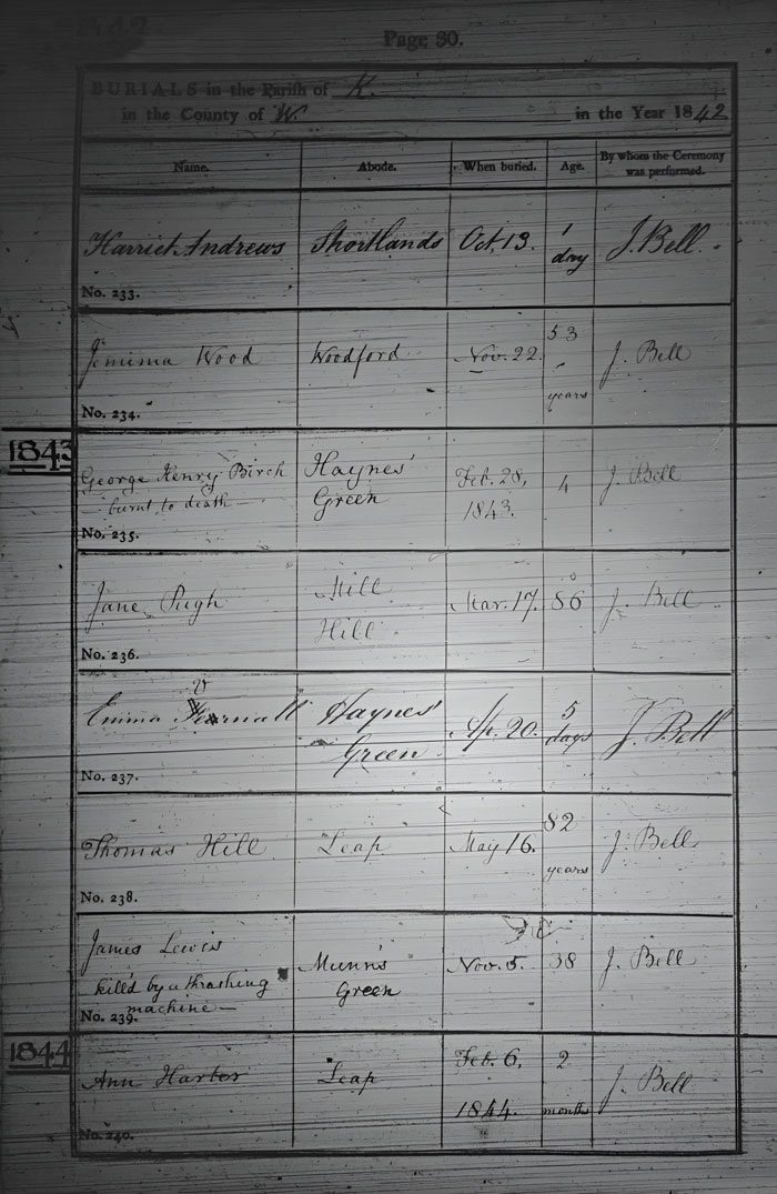 Andrews Shortlands. 13 October 1842 1 day John Bell 234 Jemima Wood Woodford. 22 December 1842 53 John Bell 235 George Henry Birch Haynes Green. 28 February 1843 4 John Bell 236 Jane Pugh Mill Hill. 17 March 1843 86 John Bell 237 Emma Vernall Haynes Green. 20 April 1843 5 days John Bell 238 Thomas Hill Leap. 16 May 1843 82 John Bell 239 James [killed by thrashing machine] Lewis Munn's Green. 5 November 1843 38 John Bell 240 Ann Harber Leap. 6 February 1844 2 months John Bell