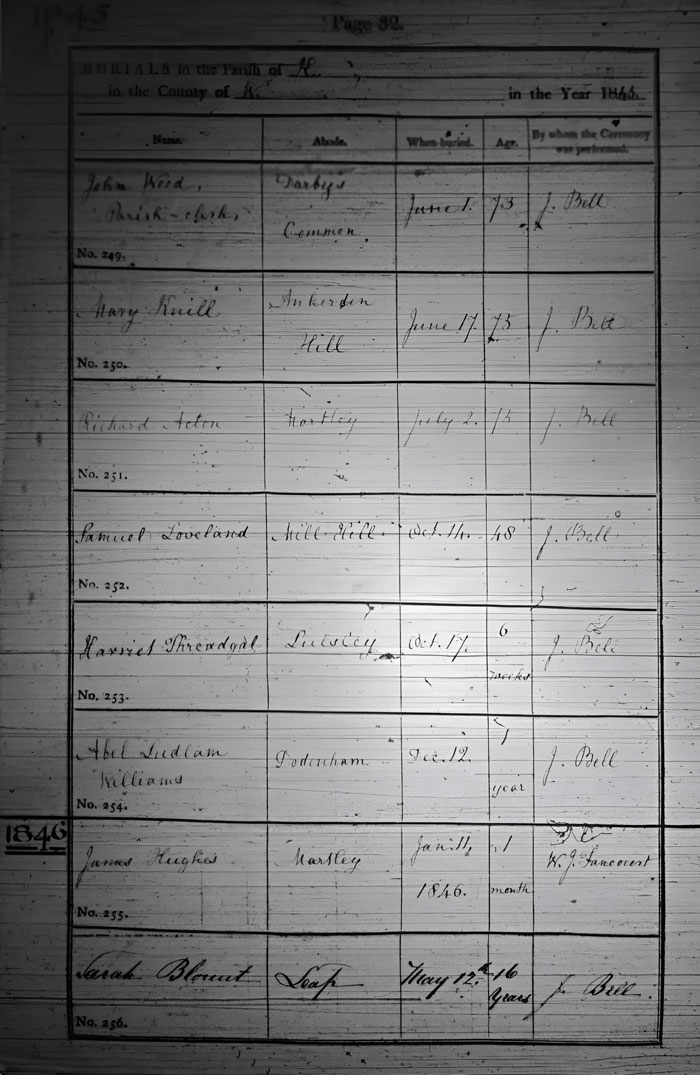 Number Forename Surname Residence Burial Day Burial Month Burial Year Age Ceremony Performed by 249 John [Parish Clerk] Wood Darby's Common. 1 June 1845 73 John Bell 250 Mary Knill Ankerdine Hill. 17 June 1845 73 John Bell 251 Richard Acton Martley. 2 July 1845 75 John Bell 252 Samuel Loveland Mill Hill. 11 October 1845 48 John Bell 253 Harriet Threadgal Lulsley. 17 October 1845 6 weeks John Bell 254 Abel Ludlam Williams Doddenham. 12 December 1845 1 John Bell 255 James Hughes Martley. 11 January 1846 1