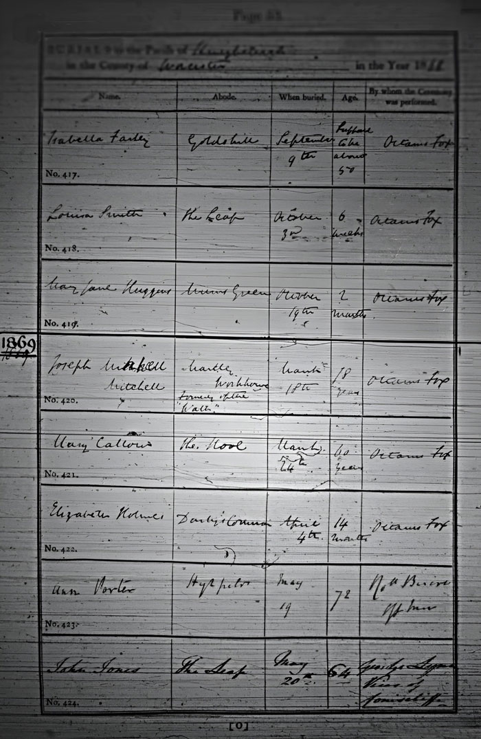 Rector418 Louisa Smith The Leap. 3 October 1868 6 weeks Octavius Fox 419 Mary Jane Huggins Munn's Green. 19 October 1868 2 months Octavius Fox 420 Joseph Mitchell Martley. 18 March 1869 18 Octavius Fox 421 Mary Callow The Hoo. 24 March 1869 60 Octavius Fox 422 Elizabeth Holmes Darby's Common. 4 April 1869 14 months Octavius Fox 423 Ann
