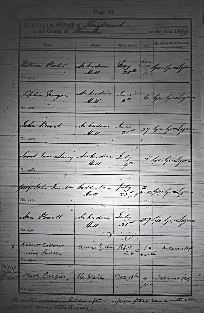 monthsGeorge Lynn 430 Ann Powell Ankerdine Hill. 31 July 1869 87 George Lynn 431 Albert Callow *[alias Sadler] Munn's Green. 24 September 1869 7 months Octavius Fox *[The mother called him Sadler after a person of that name, with whom she'd committed bigamy] 432 Olive [killed by fall off hop pole] Brazier The Walk. 16 December 1869 4 Octavius Fox