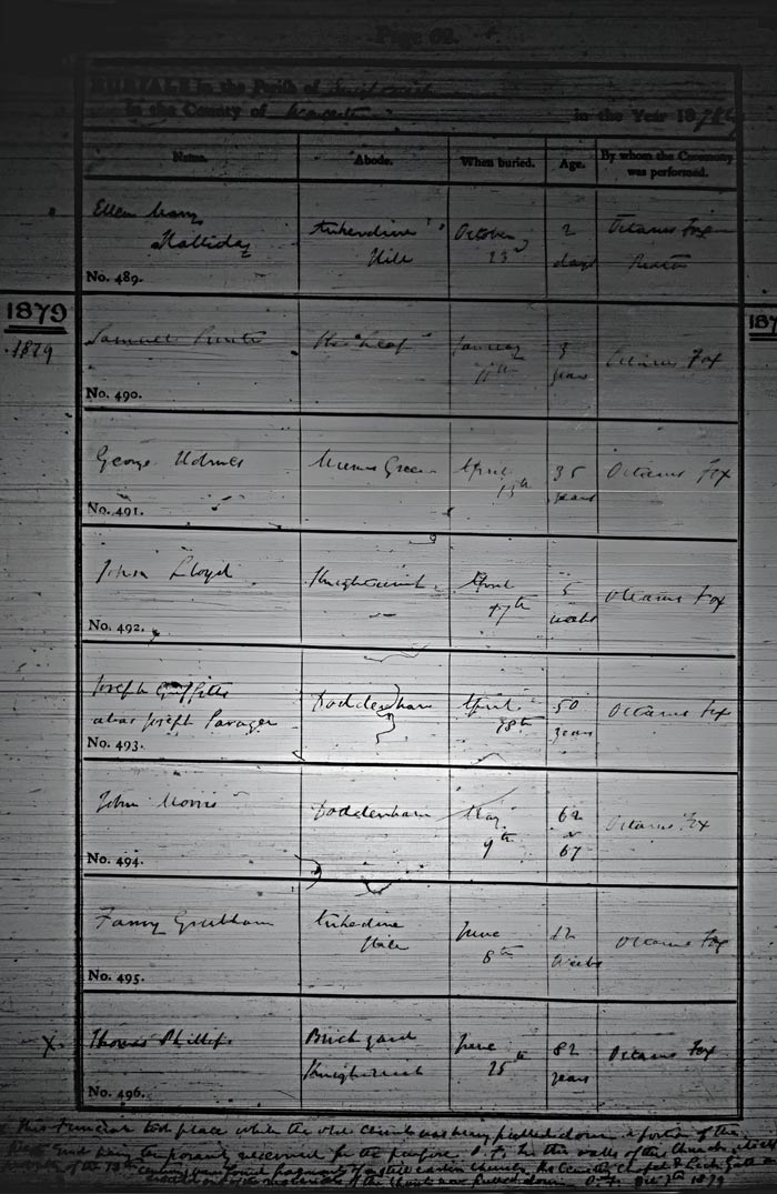 Number Forename Surname Residence Burial Day Burial Month Burial Year Age Ceremony Performed by 489 Ellen Mary Holliday Ankerdine Hill. 13 October 1878 2 days Octavius