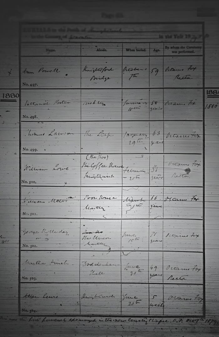 | *497 - This was the first funeral solemnized in the new Cemetery Chapel. Octavius Fox, October 7th, 1879. |