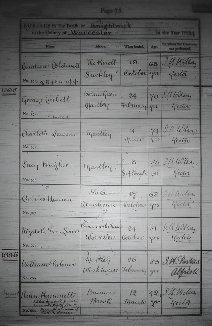 | [ Inquest: John Hammett was killed by a fall from his horse, near Hopton Court. He was a huntsman of the Knightwick Harriers. Hopton Court is by Leigh Brook, in Hopton Lane, Alfrick] |
