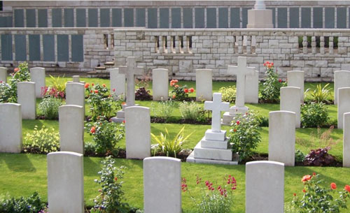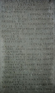 The Hollybrook Memorial is situated in Southampton (Hollybrook) Cemetery behind the plot of First World War graves near the main entrance. The cemetery is located off Tremona Road, opposite the general Accident & Emergency Hospital. From junction 5 of the M27, take the A35 (Burgess Road/Winchester Road) and follow the signs for the general hospital. The Hollybrook Memorial commemorates by name almost 1,900 servicemen and women of the Commonwealth land and air forces* whose graves are not known, many of whom were lost in transports or other vessels torpedoed or mined in home waters (*Officers and men of the Commonwealth's navies who have no grave but the sea are commemorated on memorials elsewhere). The memorial also bears the names of those who were lost or buried at sea, or who died at home but whose bodies could not be recovered for burial. Almost one third of the names on the memorial are those of officers and men of the South African Native Labour Corps, who died when the troop transport Mendi sank in the Channel following a collision on 21 February 1917. Other vessels sunk with significant loss of life were: HS Anglia, a hospital ship sunk by mine off Dover on 17 November 1915. SS Citta Di Palermo, an Italian transport carrying Commonwealth troops, sunk by mine off Brindisi on 8 January 1916. In rescuing survivors, two Royal Naval Otranto drifters were themselves mined and blown up. HMTs Donegal and Warilda, ambulance transports torpedoed and sunk between Le Havre and Southampton on 17 April 1917 and 3 August 1918. HS Glenart Castle, a hospital ship torpedoed and sunk off Lundy on 26 February 1918. SS Galway Castle, torpedoed and sunk in the Atlantic on 12 September 1918. RMS Leinster, the Irish mail boat, torpedoed and sunk in the Irish Sea on 10 October 1918. Among those commemorated on the Hollybrook Memorial is Field Marshall Lord Kitchener, Secretary of State for War, who died when the battle cruiser HMS Hampshire was mined and sunk off Scapa Flow on 5 June 1916. (There were 14 members of the Indian Forces commemorated here who are now known to have been cremated at Patcham Down, Sussex, and are now commemorated on a dedicated memorial there). The memorial was designed by T. Newham and unveiled by Sir William Robertson on 10 December 1930. |