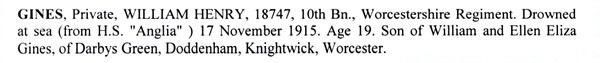 | William Henry Gines PRIVATE Service No. 18747 Age 19 Died on 17 November, 1915. Worcestershire Regiment HOLLYBROOK MEMORIAL, SOUTHAMPTON HAMPSHIRE, UNITED KINGDOM Panel 35. Son of William and Ellen Eliza Gines, of Darbys Green, Doddenham, Knightwick, Worcester. |