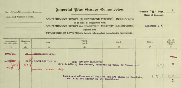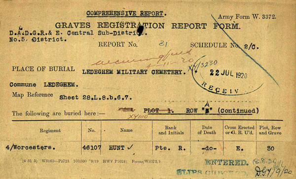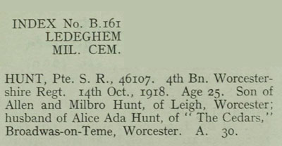 Allen and Milbro Hunt were the parents of Richard Septimus Hunt [Born in Leigh] of Knightwick, Worcester. In the 1911 Census Richard Hunt was single, aged 18, and worked as a Waggoner on Farm. Richard Septimus Hunt, aged 22, occupation Waggoner, of Cecil Cottage Ankerdine Hill. Married: Alice Ada Web, aged 22, of The Turnpike, Knightwick. On the: 27th December, 1915, at Knightwick Church. Fathers: Allen Hunt [Miller] and Samuel Webb [Farm Labourer] Witness': Philip Webb, Kathellen Webb, Gladys Mary Hunt, and John Allen Hunt. Vicar: W. S. Floyde-Radcliffe. UK, Soldiers Died in the Great War, 1914-1919. Name: Septimus Richard Hunt Birth Place: Leigh, Worcestershire. Residence: Knightwick, Worcestershire. Death Date: 14 October, 1918. Death Place: France and Flanders Enlistment Place: Worcester Rank: Private Worcestershire Regiment Battalion: 4th Battalion Regimental Number: 46107 Type of Casualty: Killed in action Theatre of War: Western European Theatre PRIVATE S R HUNT Service Number: 46107 Regiment & Unit/Ship Worcestershire Regiment 4th Bn. Date of Death Died 14 October, 1918. Age 25 years old Buried or commemorated at LEDEGHEM MILITARY CEMETERY A. 30. Belgium ![]() ![]() ![]() Ledeghem Military Cemetery is located 17 Km east of Ieper town centre on a road leading from the N8 Meenseweg connecting Ieper to Menen. The N8 leads from Ieper to Menen via Geluveld and Geluwe. On reaching the town of Menen the left hand turning onto the N32 Bruggestraat leads to Roeselare. 4.5 Km along the N32 lies the right hand turning onto Papestraat which leads to Ledegem. On reaching the village of Ledegem the first right hand turning along the Sint Eloois-Winkelstraat leads onto the Hugo Verriestlaan. The cemetery is accessed by a short path off the Hugo Verriestlaan. Ledeghem was almost captured on 19 October 1914 by the 10th Hussars, who were forced to retire the same day. It then remained in German hands for four years. On 1 October 1918, the 9th (Scottish) Division captured the village, but could not hold the whole of it; it was finally cleared by the 29th Division on 14 October. The church, the school and the civil hospital of Ledeghem were used by the Germans as hospitals, and in October 1914 to September 1918, they buried German and Commonwealth casualties in three cemeteries in the commune. Ledeghem Military Cemetery was made by the 29th Division (as "Ledeghem New Cemetery") in October 1918. The graves of 14 casualties who died in October 1914 and September and October 1918, were removed to this cemetery in October 1951 from Ledeghem Churchyard. There are now 85 Commonwealth burials and commemorations of the First World War in this cemetery. 17 of the burials are unidentified but there are special memorials to two soldiers believed to be buried among them, and one whose grave was destroyed by shell fire in Ledeghem Churchyard. The cemetery was designed by W H Cowlishaw. ![]() |