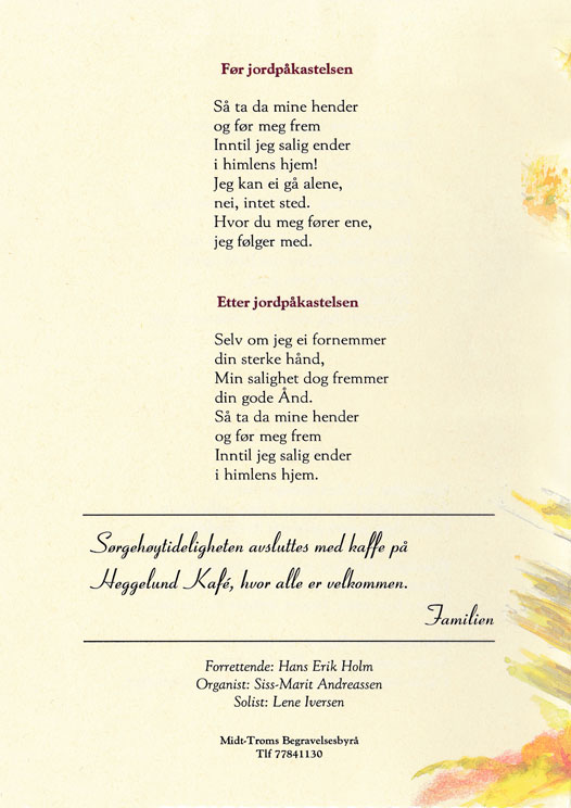 After the funeral 50 people joined the family for a light lunch at a café in Øverbygd. Then the family and relatives went back to the farm house, where Birger and his wife Ester had lived together for many years. The day after the funeral, would have been Far's 99th Birthday, Mor went to the farm, for afternoon coffee and cakes and everyone there, wished Far, a Happy Birthday.