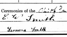 In the presence of: E. W. Smith (brides, father) and Leonora Smith, (brides sister).